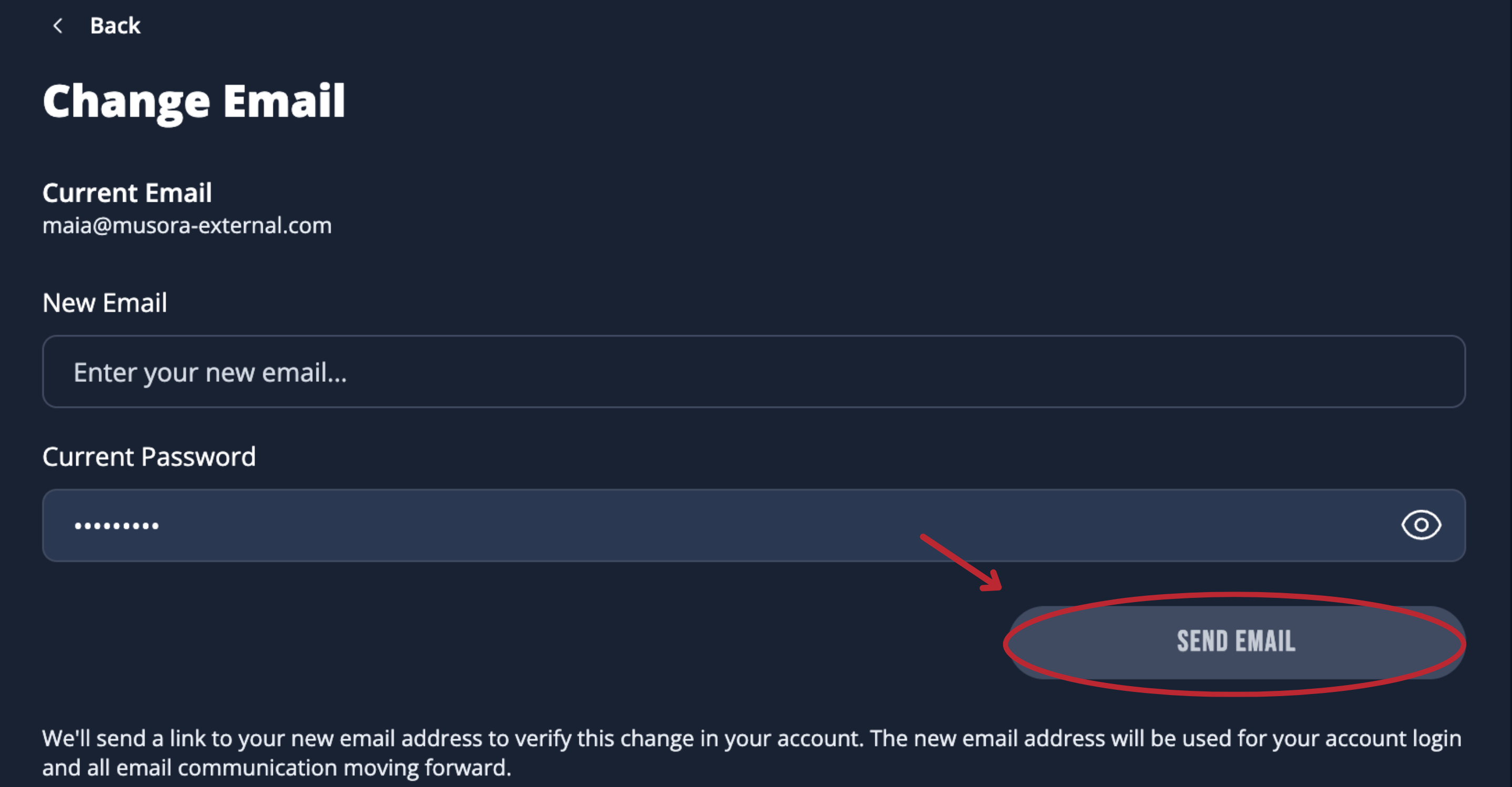 Step 4: Click the "Send Email" button in the bottom left. That email address will be sent an email from Musora in order to verify this change. When you receive this email, follow the instructions to change your attached email.